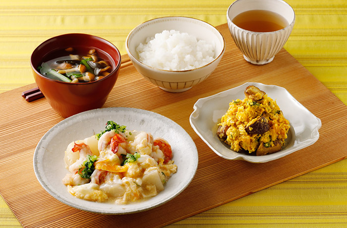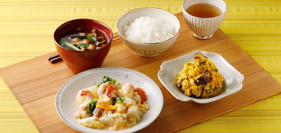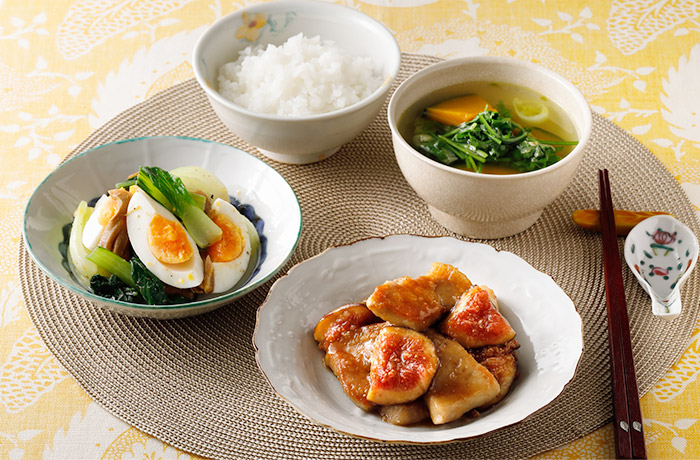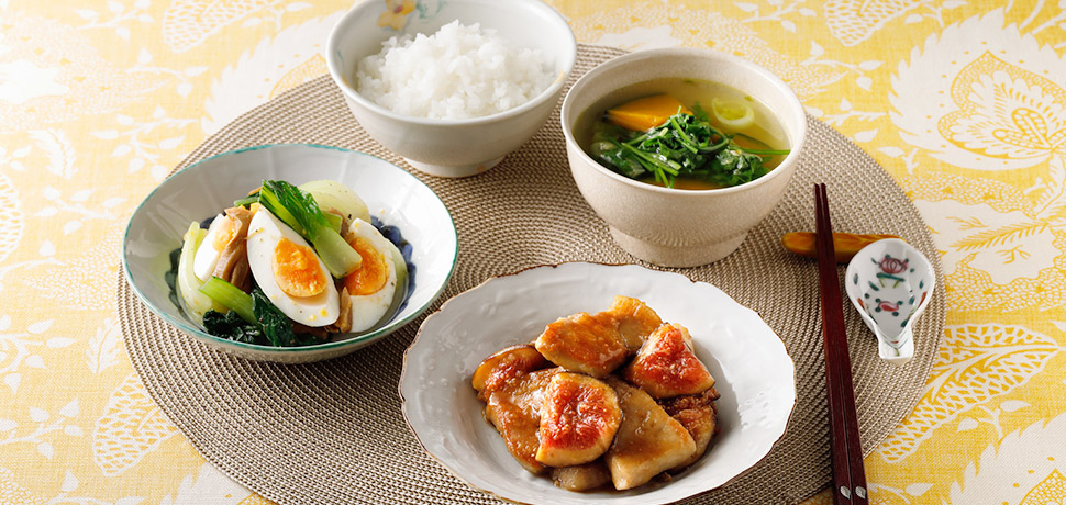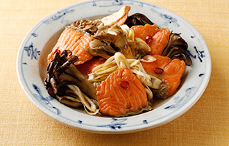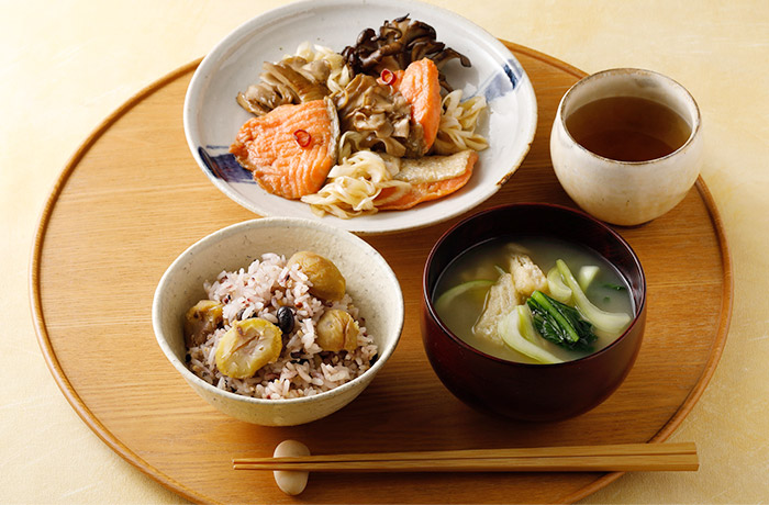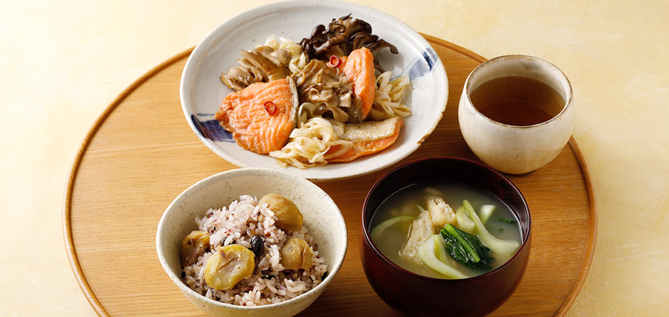 - 旬の鮭と栗がメインの秋ならではの和風献立です。秋鮭と舞茸は揚げ焼きにして南蛮漬けに、栗は雑穀と合わせて栗ごはんに、チンゲンサイは汁ものに。定番の秋食材を使ったメニューですが、鮭の揚げ焼きの衣には米粉を使って、栗ごはんには雑穀を加えて、旬食材の特長を引き立たせる工夫を凝らしています。