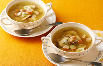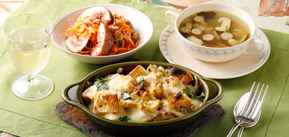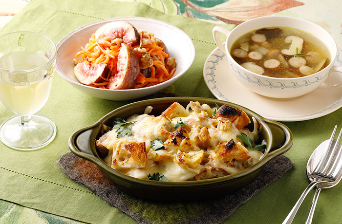 - 栗といちじく、椎茸を使った洋風献立。栗の甘みが際立つトロトロなソースのパングラタン、細切りにしたニンジンの歯ごたえといちじくの甘みが新鮮なラペ、椎茸やイタリアンパセリを余すことなく使用した、旨みの効いたスープ。3つの料理を丁度良いバランスで組み立てた献立です。