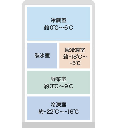 ご購入時の設定は、冷蔵室「中(約3℃)」、野菜室「中(約6℃)」、冷凍室「中(約-19℃)」、瞬冷凍室「切れちゃう冷凍 中(約-7℃)」となっております。