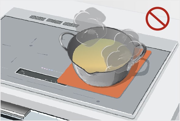 IHクッキングヒーターのトッププレートに紙や汚れ防止カバーを敷くと、鍋やフライパンの熱で焦げたり、IHクッキングヒーターの安全機能が正しくはたらかず、発煙や発火の原因となる危険性があります。揚げ物調理時も、汚れ防止カバーや紙など絶対に敷かないでください。必ずトッププレートに直接鍋を置いてください。
