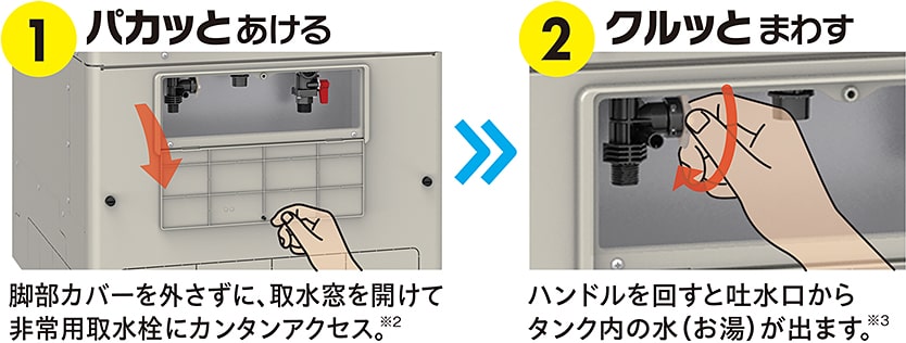 さらに三菱 エコキュートの頼れる機能「パカっとハンドル」※1なら、貯湯ユニット本体下部の脚部カバーを外さず※2に取水窓を開け、すばやく非常用取水栓へアクセスできます。ホース不要でハンドルを回すと吐水口からタンク内の水(お湯)が出る点も安心。※3