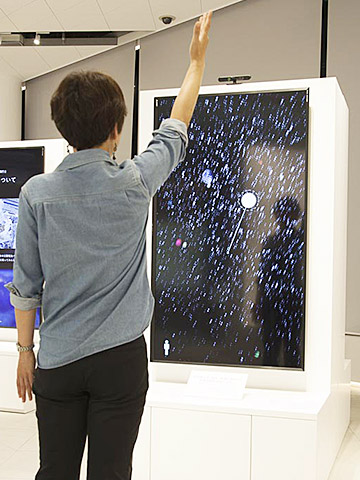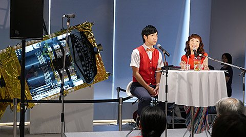 イベント期間中のコラボレーションコンテンツとして登場したのは、注目のクリエイティブチーム、カイブツの映像作品「PIECE OF UNIVERSE」。64面4Kマルチの壮大なディスプレイに描かれる本物の宇宙映像は、まさに圧巻!宇宙から銀河系、太陽系、そして地球や生物、さらにミクロなものへと視点を変えていくことで、自分も宇宙の一部なのだと実感できる作品となっています。またフロアの一角には、「ひまわり8・9号」や「みちびき」にも使われている三菱電機の標準衛星プラットフォーム「DS2000」の1/2模型も展示。フロア全体で宇宙を体感できます。