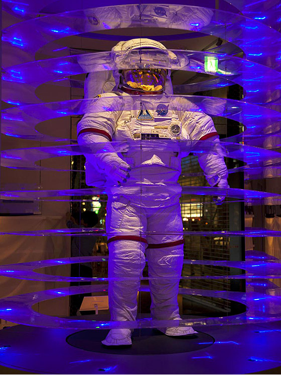 フロアに足を踏み入れてまず目に飛び込んできたのは、光り輝くアストロノート。まるで銀座に宇宙飛行士が降り立ったかのような演出に、早くもイベントへの期待が高まります。これは、アーティスト松尾高弘氏による宇宙服×レーザー光によるライティングアート「BLUE ORBIT」。無数の光がダイナミックな軌道(ORBIT)を描きながら宇宙服を照らす様は、まさに人類が宇宙の洗礼を受けているかのような神々しさ。時間と共に刻々と表情を変えていくため、ずっと眺めていても飽きません。日が落ちた時間に見ると、より一層神秘的な光景を楽しめます。