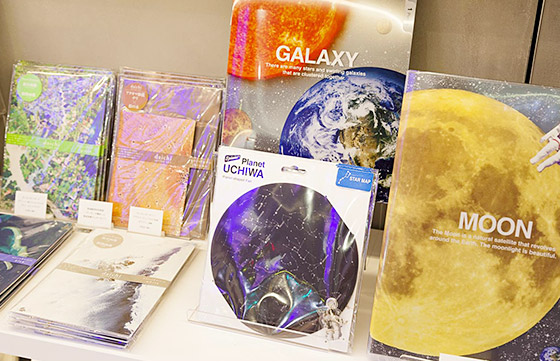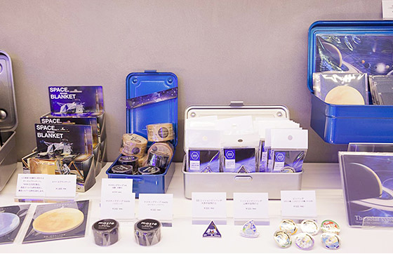 1Fのショップでは、宇宙をテーマにしたグッズをイベント期間限定で販売しています。文房具やピンバッチ、トートバッグなど来館の記念になるアイテムが盛りだくさん。なかでも編集部員の興味をそそったのはスペースフード(宇宙食)!海老ピラフやチョコレートケーキ、ストロベリーアイスなど、「え、こんなものが?」という味覚がズラリと並んでいるのです。ひと味違った銀座のおみやげにいかがでしょう?