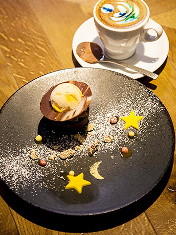 METoA Ginzaを訪れたらぜひ立ち寄っていただきたいのが、Me's CAFE & KITCHEN。イベント期間中は、1日20食限定のコラボメニューが登場します。メインスイーツの「サターンガトーショコラ」は、マンゴーアイスとチョコレートで土星を象ったガトーショコラに、銀河や月を模した粒々のソースをアレンジ。チョコとスパイスの絶妙な組み合わせが、未体験の食感を楽しませてくれます。ドリンクには、地球をイメージしてカラフルなアートを施した「スペースモカ」をセット。新感覚スイーツで、宇宙気分を味わってみませんか?