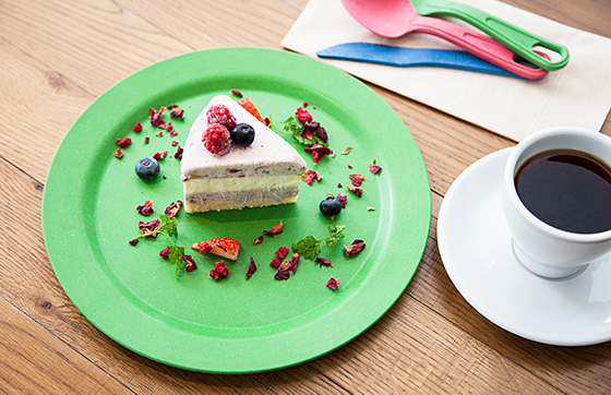 毎回楽しみにされる方も多い、Me‘s CAFE & KITCHEN in METoA Ginzaのコラボメニュー。今回登場するのは、環境活動の3R(リデュース、リユース、リサイクル)にかけた、3種のベリー“3B”のアイスケーキです。新鮮なストロベリー、ラズベリー、ブルーベリーをコンポートにし、分けて三層に積み重ねることで、おいしく美しいスイーツが生まれました。このアイデアは、家電リサイクルの「解体」「選別」「再生」の工程にインスパイアされたもの。プレート&カトラリーにも、“土に還る”天然素材を使用しています。さわやかなベリーの酸味とひんやりなめらかな舌触りに、シナモンの香りとクルミの食感をプラスした、大人のテイストをお楽しみください。