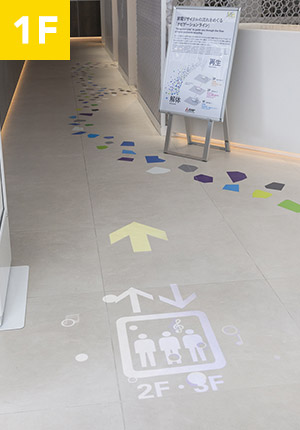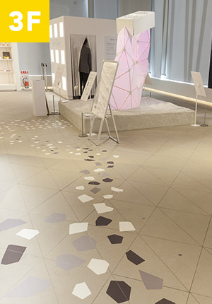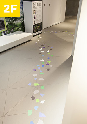 1Fアテンションゾーンから続く、カラフルな破片のナビゲーションライン。2F、3Fへと流れを辿っていくと、徐々に破片が小さく、色も白へと近づいていきます。そう、実はこれ、プラスチックのリサイクル過程をモチーフにしているのです。廃材が真っ白なプラスチックに生まれ変わるゴールを目指し、館内を回ってみましょう。