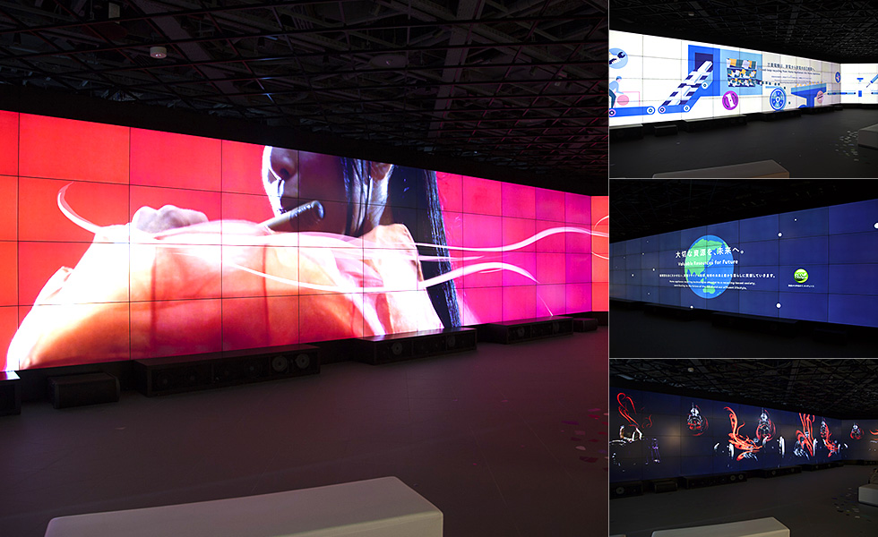 ズシンと響く和太鼓の鼓動。視界に広がる艶やかな舞。そしてそれらに合わせて会場を吹き抜ける風……。眺めるだけの映像の枠を超え、全身に訴えかけてくるのが、METoA VISIONで公開中の「Re-Birth 循環の鼓動を聴く」です。巨大な64面マルチディスプレイを舞台に展開されるのは、和太鼓アーティスト集団DRUM TAOの演奏とアニメーションの融合により、家電の生まれ変わりを描くスペシャルコラボムービー。渾身のパフォーマンスも圧巻ながら、解体され、破砕された本物のリサイクル素材を映像に使うことで、リアルな迫力を生み出しています。使われなくなった家電がその先に見るドラマチックな世界を、目で、耳で、肌で感じてみてください。