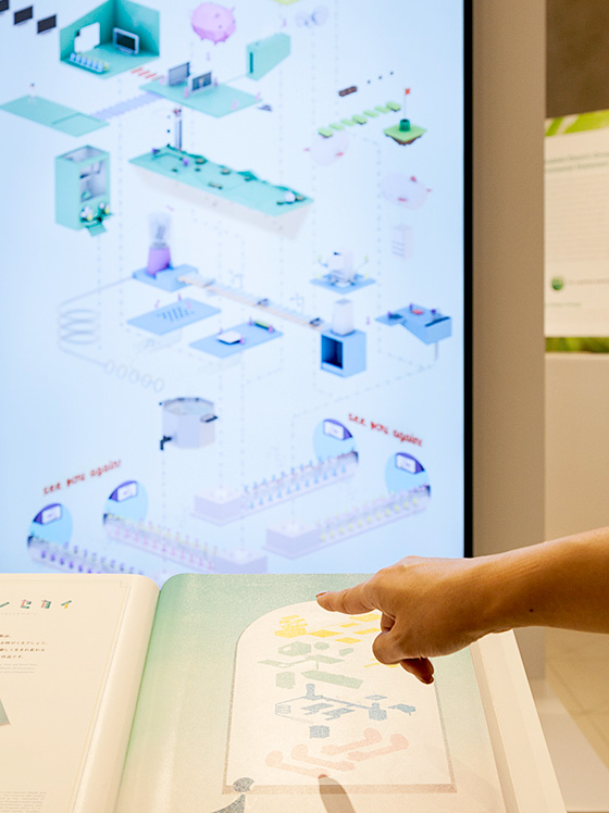 デジタルサイネージに映し出されるのは、遊園地のような世界で、楽しげに動き回るこびとたち。絵本に見立てた手元のインターフェースに指をあててズームインしてみると、そこはゆかいな家電のリサイクル工場だとわかります。クリエイティブラボLENSによるインタラクティブアート「カイタイノセカイ」は、役目を終えた家電がリサイクル素材として生まれ変わるまでのドラマを、可愛らしいアニメーションとこびとたちのコミカルな動きで表現。指でこびとたちの動きを追っていくうちに、自然とリサイクルの面白さに引き込まれていきます。