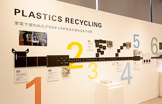 壁面ディスプレイ「PLASTICS RECYCLING」では、三菱電機の家電リサイクルの工程を10段階に分けて紹介。大きさや色の違うブロックやリサイクル素材の実物を使って、手解体から破砕、選別、ペレット化までの流れをわかりやすく展示しています。また、水や磁石などを使って選別の実験をできるコーナーも用意。自分の手で、家電リサイクルを疑似体験できます。