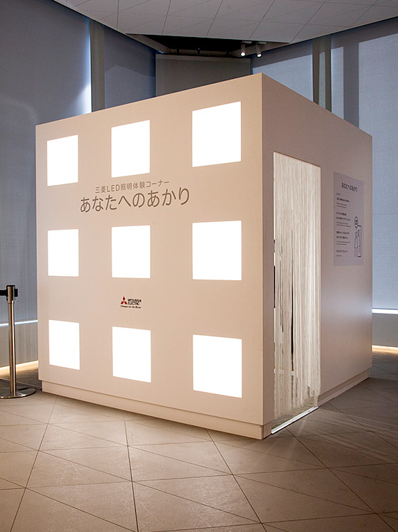 3Fでは、LEDがもたらす多彩な光をユニークなしかけで体験できる「あなたへのあかり」も展示しています。特設ボックスの中に入ると、目の前には大きな鏡。そこに映し出される自分自身を、さまざまな色の光でLEDが照らします。すると、光の種類によって肌の色や雰囲気が変化していくのがわかるはずです。自分をもっともキレイに見せてくれる光を見つけたら、ボタンで合図。鏡の中にキラキラと光るアニメーションが現れるので、スマホなどで自撮りをしてみましょう。自分専用ライトで、素敵なポートレート撮影を楽しめます。