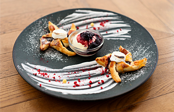 編集スタッフも毎回楽しみにしている、Me's CAFE & KITCHENのコラボメニュー。今回は、お皿の中で回るウィンドミル(風車)をイメージしたチェリーパイが登場しました。注文を受けてから焼き上げるという熱々のパイの中には、自家製のアメリカンチェリージャムがたっぷり。冷たいアイスクリームとの相性も抜群です。生クリームで気流が描かれたプレートには、色とりどりのドライフランボワーズやスパイスチョコ、ピンクペッパーが散りばめられ、組み合わせごとに新たな味や食感を楽しませてくれます。イベント期間中だけの限定メニューなので、ぜひお見逃しなく!