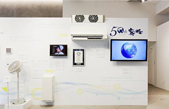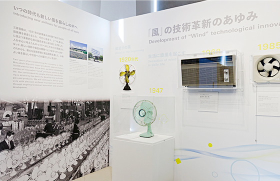 まずはパネルで、三菱電機の風の歴史をおさらい。このコーナーでは、1921年に始まる創業以来の風との関わりをコンパクトに学べます。エポックメイキング製品の実機も展示され、なんと1947年発売の若葉色扇風機の実物も登場。色合いも爽やかなこの1台は、それまで黒一色だった扇風機のイメージを一新し、戦後日本に明るい風を吹かせたそうです。また、コーナーには貴重な霧ヶ峰初期型モデルの展示もありました。霧ヶ峰の誕生は、半世紀前の1968年度。50周年を記念した映像も紹介されています。