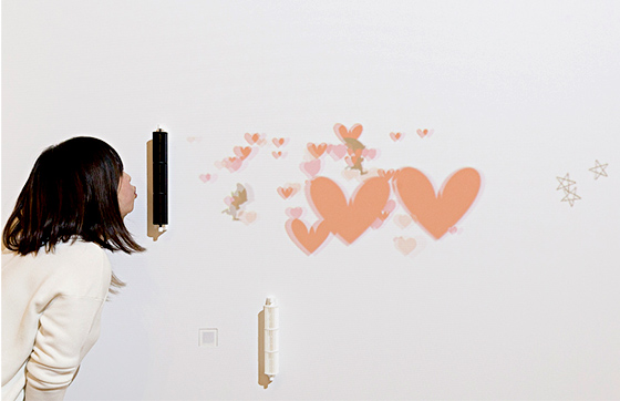 風を遠くまでまっすぐに届ける「ラインフローファン」。今から50年前、三菱電機が世界で初めて霧ヶ峰に搭載※した円柱形の送風機です。エアコン室内機の軽量・薄型化に貢献したラインフローファンは、壁掛形エアコンの標準として今も世界中の多くの製品に使用されています。METoA3Fでは、この“まっすぐに進む風”を自身でつくり出す疑似体験コーナーを用意。ラインフローファンを模した小さなユニットに息を吹きかけると、さまざまな効果音とともにハート型の花びらや風の精がスクリーンを流れていきます。9種類のアニメーションを楽しめるのだとか。みなさんもぜひトライしてみてください。