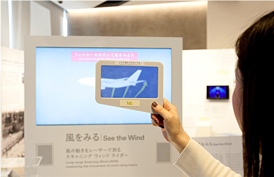 「スキャニング ウインド ライダー」とは、風の動きを計測・可視化する装置。空港周辺の風の情報を管制塔に送ることで、飛行機の安全な離着陸に貢献しています。このスキャニング ウインド ライダーを製造しているのは、国内では三菱電機だけ。※日本で唯一の風を見る技術を、会場では特殊なフィルターを使って体験できます。飛行機が飛んでいる映像に向けて、フィルターをかざしてみると……?風の動きを通して、飛行機の着陸シーンの舞台裏が見えてきます。