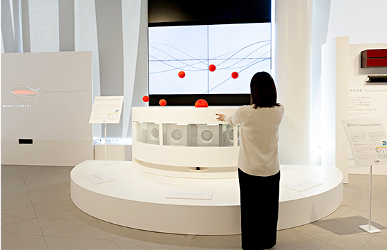 白いステージに収まった7つの赤い玉。編集スタッフが近づくと、その1つがポーンと空中に飛び上がり、やがて映像や音楽に合わせて全部の球が踊り始めました。何もない空間に繰り広げられるその光景は、さながら“風のダンス”のよう。あっと驚く仕掛けのタネは、ダクト用換気扇やレンジフードファンなどに使われている「シロッコファン」にありました。持ち前の“強く押し出す風”とコントロール力により、球体をリズミカルに操っているのです。人が近づく方向に向けて、動きを変化させる可愛らしい球体たち。その華麗なダンスは必見です。