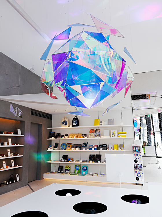 シンボルオブジェが放つ色とりどりの光に彩られた1Fエントランスは、いつもと違うMEToA Ginzaの表情を楽しませてくれます。ショップやカフェも、期間中は「Space Challenge in Ginza」仕様。宇宙関連のグッズやここでしか味わえないスイーツが用意されていました。