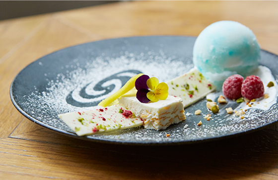 METoA Cafe & Kitchenでは、恒例のイベントコラボスイーツが登場。今回は、人工衛星と地球をイメージした、オリジナリティあふれるひと皿となっています。人工衛星は、サクサクのコーンフレークを絡めたクリームチーズ製。スライスレモンのアンテナや太陽電池パドルを模したピスタチオ入りホワイトチョコレートとのほどよい食感とハーモニーを楽しめます。そのお隣のブルーキュラソーで色づけたレモンシャーベットは、青い地球を表現。ひんやり、さっぱりした口どけは、クリームチーズとの相性も抜群です。お皿に広がる小さな宇宙を、ぜひ目と舌で楽しんでみてください。