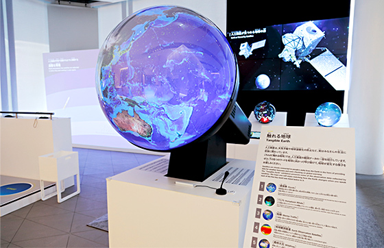 体験型シアター「人工衛星の旅」では、人工衛星が立ち向かう過酷な宇宙への旅を、ダイナミックな音と映像、振動で紹介。シアター前の所定位置でヘッドフォンを装着することで、ロケットの発射から分離、太陽電池パドルの展開までの状況を全身で体感でき、まるで人工衛星になったかのような気分を味わえます。そして、その人工衛星から見た地球をさまざまな角度から観察できるのが、インタラクティブなデジタル地球儀。キーワードで呼びかけると画像が変化し、雲や海水温の様子はもちろん、くじらや船舶の動きまでわかります。