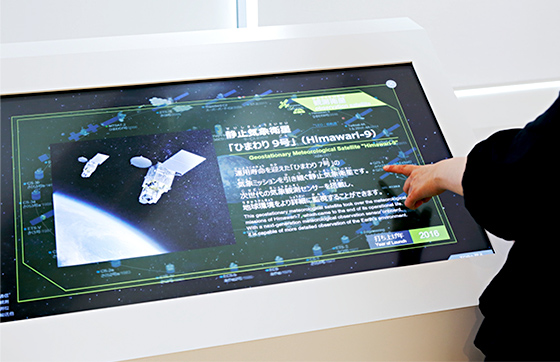 半世紀にわたり、三菱電機が製造してきた数々の人工衛星をタッチパネルで一覧。気になる項目をタッチすると、通信や測位、気象・災害予防といった衛星機能や打ち上げ年代、衛星のフォルムなどが拡大表示されます。