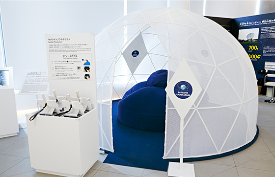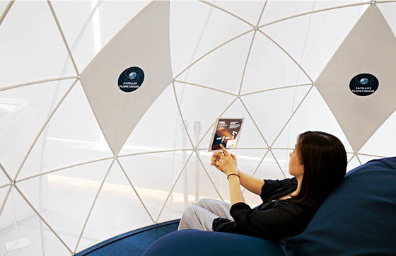 ふかふかクッションでくつろぎながら人工衛星を眺められる、プラネタリウム型ドームが登場。タブレット画面を通じて目の前に広がる宇宙空間では、4つの人工衛星を見ることができます。画面をタップすれば、人工衛星を360°回転させることもでき、ふだんなかなか見られない姿を堪能できます。
