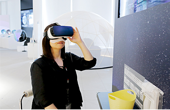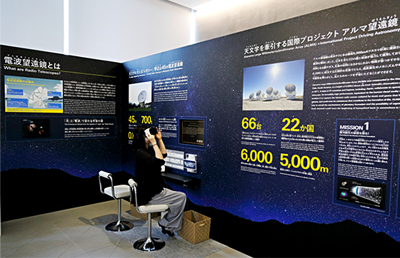長野県の国立天文台、野辺山にある直径45mの電波望遠鏡。チリ・アタカマの高地砂漠に並ぶ66台のアルマ望遠鏡。三菱電機が製造・開発に携わった2つの電波望遠鏡をさまざまな数字やトピックスで紹介するのが、このコーナーです。目では見えないものを観測できる電波望遠鏡の仕組みや実際の観測画像を紹介するほか、VRを使った疑似体験も用意。野辺山では巨大望遠鏡アンテナの迫力を体感、アルマでは望遠鏡のそばから満天の星を眺めることができます。