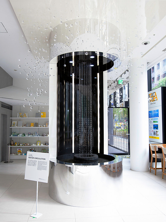 水の旅のはじまりを飾るのは、1Fエントランスのシンボルオブジェ「Water Circulation」。幾本もの線を描いて流れ落ちる水を眺めていると、途端に水滴が止まって見えたり、上に上っていったり……と不思議な動きに「?!」となります。これはストロボの点滅による目の錯覚らしいのですが、そう説明されても本当に水が動いているようにしか見えません。編集部員も何度も目を凝らしてみたり、思わず水に手を伸ばてみましたが、水自体は常に上から下に流れ落ちていました。ちなみに水の柱を囲む泡のオブジェクトは、オゾンやマイクロバブルをイメージしています。空から降ってきた雨がまた空に還っていく様を表現した「Water Circulation」は、まさに今回のテーマにぴったりの作品。ぜひ、その目で「水の循環」をお楽しみください。