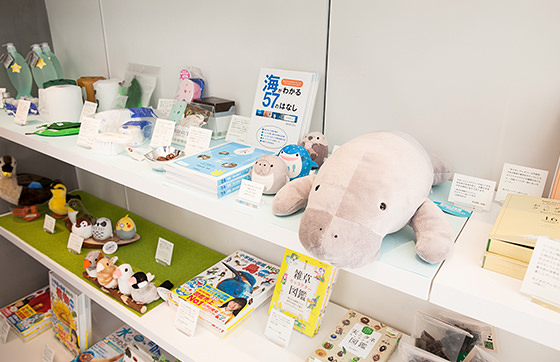 今回は、「水の循環」と「生物多様性」を感じられるアイテムがずらりと並んでいました。一番人気は、2FのMEToA VISIONでも大活躍するマナティーのぬいぐるみ。さらに、洗剤を使わないスポンジやブラシ、ふきんなど暮らしに役立つグッズも注目を集めていました。環境にやさしいだけでなく、デザインが可愛らしいのもポイント。ミュージアムショップ感覚で楽しめるコーナーです。