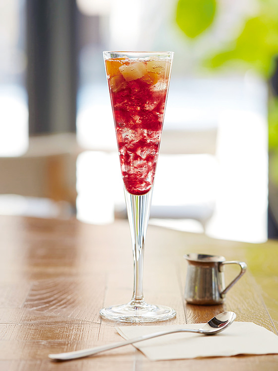 毎回楽しみにしている人も多い、METoA Cafe & Kitchenのイベントとコラボレーションした限定スイーツには、「マーブルゼリースパークル」が登場。シュワッとした炭酸水に、エルダーフラワーのクラッシュゼリー、洋梨、葡萄、黄桃の3種のフルーツが浮かんだスイーツドリンクです。甘く煮詰めたワインシロップを注ぐと、ワインの香りが循環し、グラスの中が秋の夕景色に。炭酸水をスパークリングワインに変更すれば、カクテルとして楽しむこともできます。いつもよりちょっと大人のスイーツで、イベントの余韻を楽しんでみませんか。