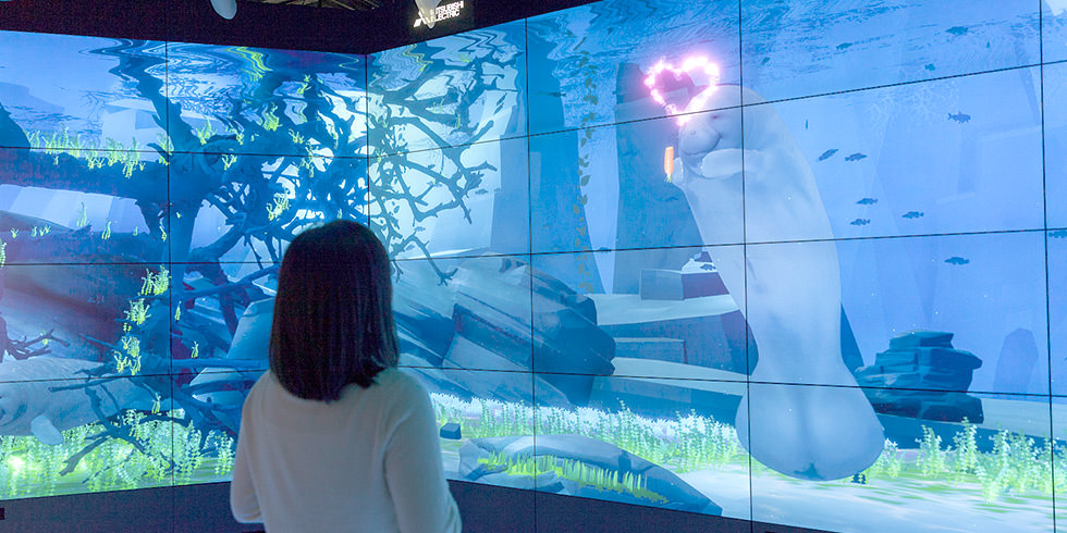 目の前に広がる迫力の映像から足元に広がる床、そして音響まで、すべてが幻想的な水の空間に包まれた2F。まるで水中に潜り込んだような錯覚に陥るこのスペースは、鳥羽水族館の監修による「マナティーと光のアクアリウム」。画面に向かってジェスチャーをすれば、エサが出てきてマナティーが食べてくれたり(好物のニンジンをあげるとハートマーク付きで喜んでくれます)、泡のリングをくぐり抜けてくれたり、フロア内のソファに腰掛けるとマナティーが近づいてきたりと、マナティーたちとのインタラクティブなふれ合いも楽しめます。水が汚れてきたら、オゾンの力で水槽をキレイにしてみましょう。実はこの水をキレイにする三菱電機の「オゾナイザー」は、実際に鳥羽水族館のマナティーの水槽でも利用されています。澄んだ水の中でマナティーたちと遊ぶ心地よいひととき。何度でも訪れたくなる、癒しのアクアリウムです。