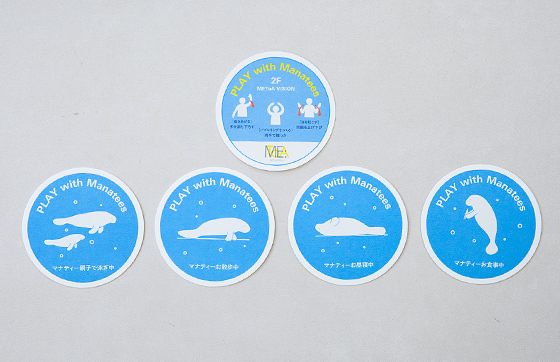 2Fでは、かわいいマナティーのイラストが描かれた特製コースターを配布しています。イラストは全部で4種類あり、裏側にはマナティーたちとふれ合うためのジェスチャーの説明も。まずはこちらを見て、アクアリムの楽しみ方をマスターしましょう。コースターは、マナティーたちと遊んだ記念に!