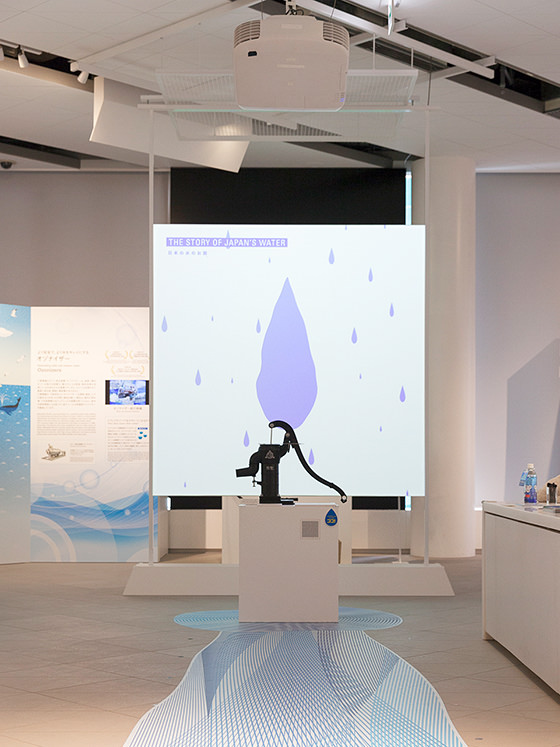 3Fのスタートは、日本の水事情を映像で学ぶイントロダクションから。日本の降水量や使用量、水道普及率など、意外と知られていない事実も多くあることに気付かされます。手前の手押しポンプを押すことで、次々に映像が切り替わる仕掛けになっています。