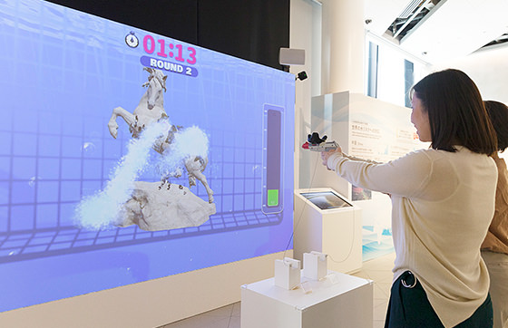 暮らしの水はどこから来て、どこにどのように還っていくのか。知っているようで知らない壮大な“Water Journey”を水玉のキャラクターとともに旅するのが、アニメーション展示「ウォーターストーリー」です。繰り返しめぐる「水の循環」には、水をキレイにする技術が欠かせません。たとえば、オゾンの力で水を浄化する三菱電機の「オゾナイザー」もそのひとつ。アニメーションでその重要性を学んだあとは、隣にある「オゾンクリアチャレンジ」でオゾナイザーを疑似体験してみましょう。