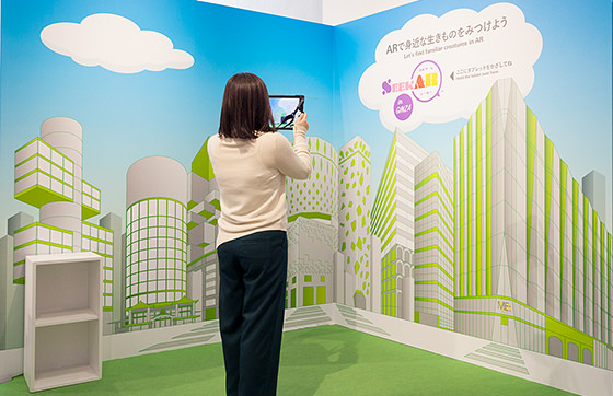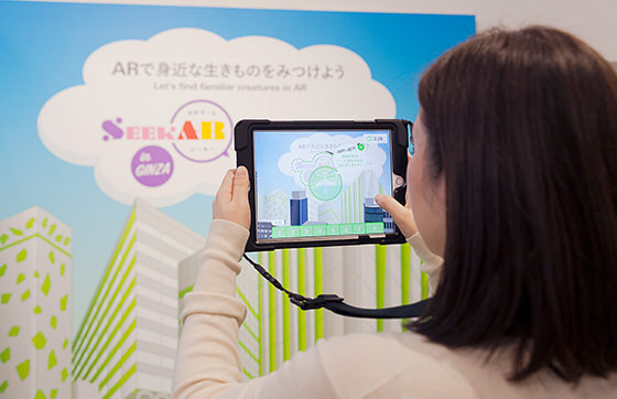 事業活動による生態系への影響を低減し、自然と共生するために「生物多様性保全」に取り組む三菱電機。全国の各事業所では「生きもの調査」を実施し、地域固有種の保全や外来種の管理、生態系を考慮した緑地整備などを行っています。そうした調査の一端をARで体験できるのが、「SEEK“AR” in Ginza」。タブレットをかざすと銀座周辺の街並みが現れ、都会に生息する鳥や昆虫などを探せます。ターゲットは全部で8種類。なかには、意外な生きものたちも? ぜひコンプリートを狙ってみてください。