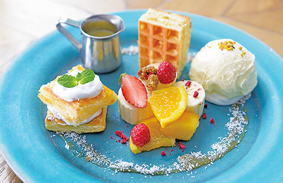 METoA Cafe & Kitchenでは、コラボスイーツ「パティスリーシェアリング」でエネルギーをシェアする都市を表現。お皿の上に並んだワッフルやパイ、バニラアイスが「都市」をイメージし、中央には「エネルギー」に見立てた“スーパーフード”マルベリーなどのフルーツが並びます。食べる前に、レモン風味のメイプルシロップを回し掛けると、シロップでつながったスイーツたちは、まるで“エネルギーをシェアし、より良くなる”未来の都市のように、より美味しくなります。あまりのかわいさに思わず写真を撮りたくなるフォトジェニックな一皿です。ぜひお召し上がりください。
