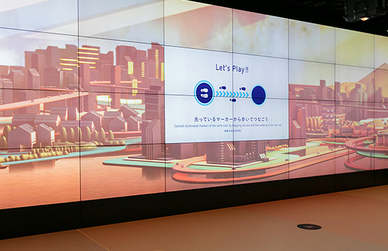モニターでは、イベントの見どころをイメージ映像でご紹介。床に映し出される「アニメーションライティング誘導システム」が、体験フロアへ誘います。光のアニメーションナビゲートに沿って、エレベーターで2Fへ上がってみましょう。