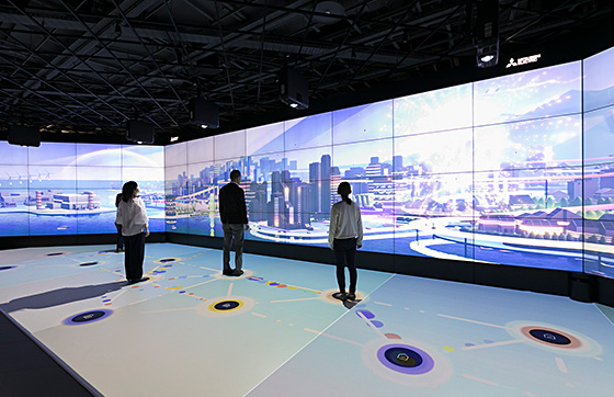 2Fでは、壁一面のMEToA VISIONと床面プロジェクションを使ったスペシャルコンテンツ「Energy-Sharing City」を展開。エネルギーをつないでシェアすることで起こる未来の都市の変化を、自分の目で、足で体感できるアトラクションです。