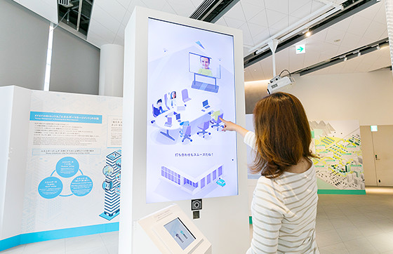 今度は、ビルの中のエネルギーマネジメントをのぞいてみましょう。「体験!最先端の省エネビル」では、アバターを使って最先端のオフィスの働き方を体験できます。まずは顔写真を撮影してアバターを作成。自分の“分身”がEV(電気自動車)で出勤し、オフィスに入る様子が画面に映し出されます。デスクに着くと、自動で照明やPCのスイッチが入り、エアコンも適温に自動調整、人がいなくなれば自動で消灯してくれるなど、最新のオフィスは快適でとっても省エネ! 体験の最後には、自分のアバターとのフォトセッションも楽しめます。