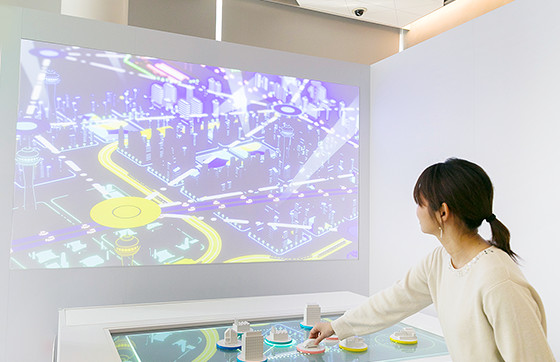 家やビル、工場等、都市全体をネットワークでつなぐことで、エネルギーの需給バランスはさらに最適化され、温室効果ガスの排出を抑えることができます。そんな未来を光と音で表現したのが、「Rhythmic Energy-Sharing」。家やビル、工場などのオブジェを操作テーブルに置くとネットワークが生まれ、つながるたびに「Good!」「Cool!」「Excellent!」などの評価とともに光と音のボルテージも上がり、都市が快適になっていく様子が楽しめます。すべてのオブジェを置いて、光り輝く都市を出現させてみましょう。
