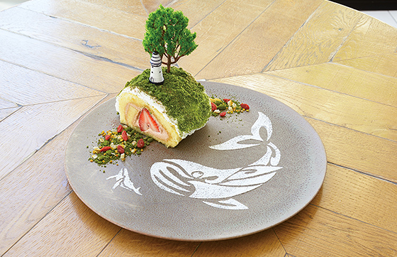METoA Cafe & Kitchenでは、コラボスイーツ「でんき島のロールケーキ」が期間限定で楽しめます。お皿の海に浮かぶのは、でんき島を模した抹茶とココアのロールケーキ。てっぺんには冒険でもおなじみの「でんきの塔」が建ち、スポンジに包まれた大きな苺はタービン発電機を表現。周囲をクコの実やゆずピール、ビーポーレン(蜂が集めた花粉)に彩られた「スイーツの島」が、新しい味覚への冒険に誘います。