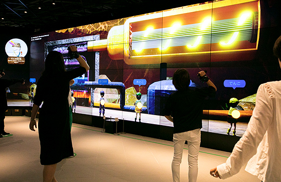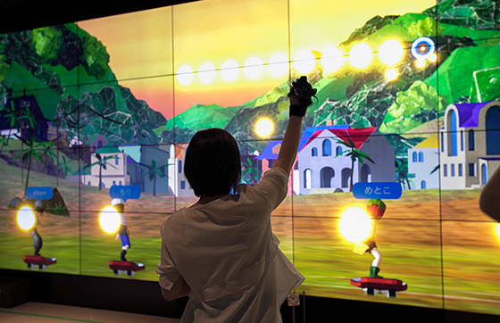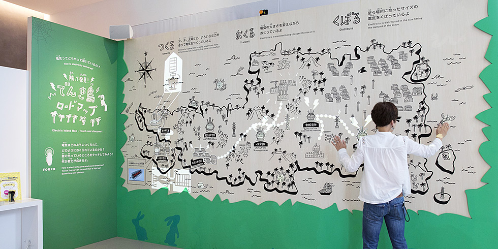 壁一面に広がるMEToA VISIONのあるMEToA2(2F)では、スペシャルコンテンツ「でんき島の大冒険」を開催中。電気をつくり届けるまでの3つのステップ、「つくる」「おくる」「くばる」を冒険ストーリー仕立てで体験できます。
