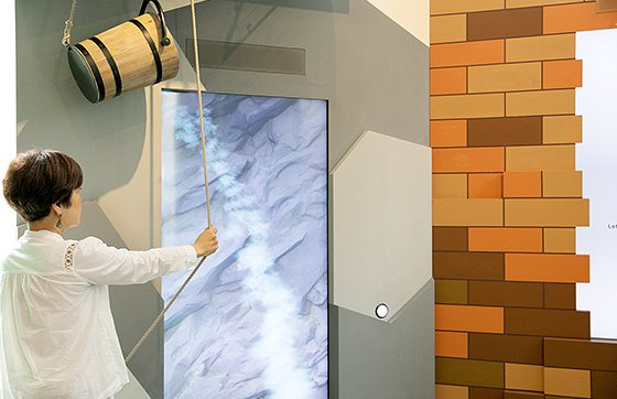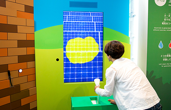 電気を「つくる」にはさまざまな方法があります。それぞれの発電方法をアニメーションで詳しく学べ、疑似体験できるのが「電気をつくろう!エレキパーク」。たとえば、「水力発電」では、高所から低所へ水を流した勢いで発電用の水車を動かし、タービン発電機を回転させる様子を、桶から水を落とすギミックで体感できます。