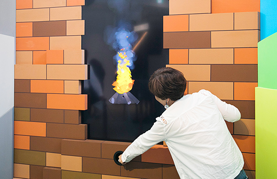 石炭やガスなどを燃やして発生させた蒸気の力でタービンを動かし、発電機を回転させることで電気をつくるのが、「火力発電」です。「電気をつくろう!エレキパーク」では、最初の着火部分を疑似体験。点火装置のスイッチを入れると、ボイラーの中にアニメーションの炎が上がります。