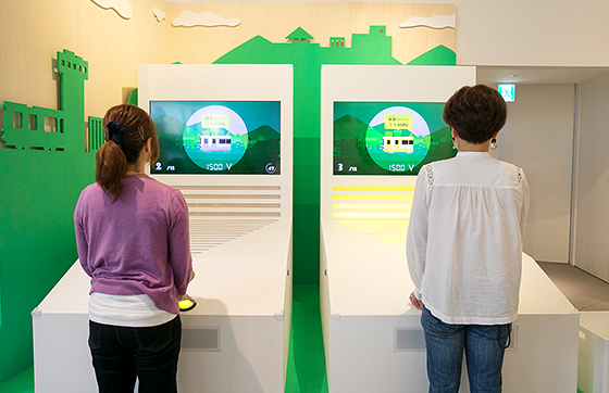 電気の大きさ(電圧)は、使う場所によって異なります。そこで、電気を「くばる」際には、住宅なら100~200V、ビルや工場では6,600Vというように、それぞれに最適な大きさにして届ける必要があります。「電気をくばろう!デリバリーチャレンジ」では、そのしくみをリズミカルなゲームで表現。画面に次々と出てくる届け先に合わせて、手元のボタンで必要な電気の大きさ(電圧)を選択しながら、電気を配っていきましょう。ポンポンと電圧を変えていく小気味よさやスピードを競う楽しさもあり、大人もつい熱中してしまいます。