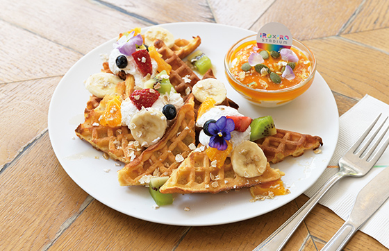毎回楽しみにしている方も多い、METoA Cafe & Kitchenのイベントコラボメニュー。今回は、個性も色彩も豊かなフルーツやスーパーフードを散りばめた、マスカルポーネクリームフルーツワッフルが登場しています。ふわっふわのワッフルは、マスカルポーネを基調とした3つのソース(マンゴー、フランボワーズ、チョコレート)をかけていただきましょう。一口ごとにおいしさが異なる、IRO×IROな味わいを堪能できます。