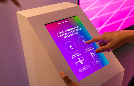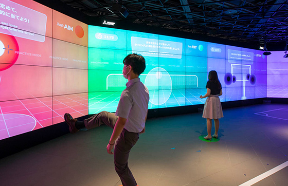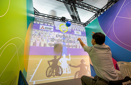 三菱電機は、障がい者用スポーツの体験プロジェクト「三菱電機 Going Up キャンペーン」を2016年より全国で実施しています。そこからヒントを得て生まれたのが、「デジタル車いすバスケットボール体験」。実際に競技で使われる車いすに座って、パスやゴールシュートを体験するアトラクションです。低い位置からシュートを決めるむずかしさも相まって、ゲームとしての面白さもやり応えも十分。パラスポーツの魅力を知ると同時に、障がい者の目線にも近づけます。