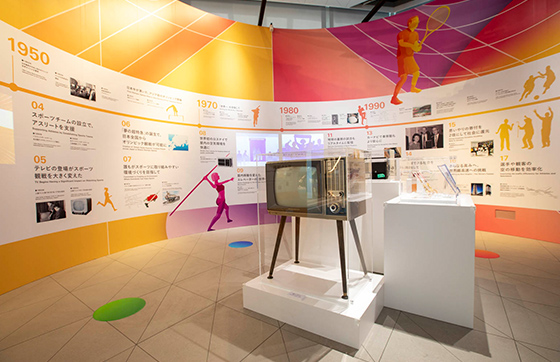 誰もがその人らしく人生やスポーツを楽しめる社会。そんな「活力とゆとりある社会」の実現に向けた三菱電機の取り組みを紹介するのが、3Fの展示コーナーです。三菱電機100年の歩みをスポーツの歴史と合わせた年表で辿れるだけでなく、観戦を支えた当時のテレビやラジオといった希少な製品実機も展示。暮らしのそばにはいつもスポーツがあったこと、共生社会への理解が着実に深まりつつあることに、あらためて気づかされます。