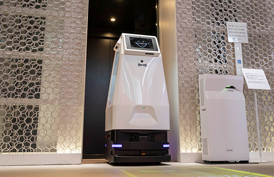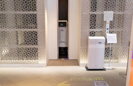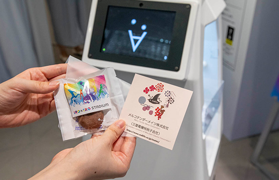 METoA Ginzaでは、平日午後限定※でデリバリーロボット“MELBot(メルボ)”のデモンストレーションが行われています。これは、3Fからスマホで呼び出すと、MELBotが自分でエレベーターに乗り、床面の光のアニメーション「てらすガイド」と連動して周囲の安全性を確かめながら、プレゼントを届けに来てくれるというもの。三菱電機のロボット技術とエレベーター技術、光アニメーション技術の連携から生まれた、“あらゆる人が使いやすいものづくり”の一例がここにあります。