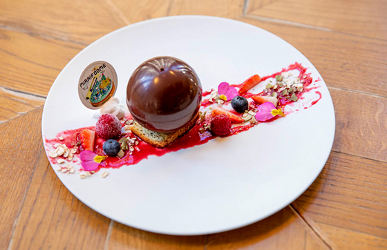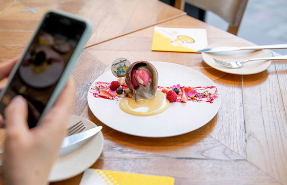 イベントごとにコラボスイーツを展開するMEToA Cafe & Kitchen。今回は、チョコレートドームがどーんと載ったユニークなひと皿が誕生しました。風変わりなのは、見た目だけではありません。ドームの上から温かいホワイトチョコソースを掛けると、中からは色鮮やかなベリー系のアイスが現れる!という驚きの仕掛けが。ホットとアイスの組み合わせや、お皿に散りばめられたイチゴやベリー、ピスタチオとの食感も相まって、一口ごとに異なるハーモニーが楽しめます。