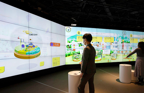 3F Exhibitionでは、働く場所を自由に選べる未来や動物と対話できる未来を体感できます。さらに三菱電機グループの取り組み紹介をはじめ、よりよい未来を実現するためのご意見ボックスも設置。みなさんのお声とともに、未来を考えていきます。